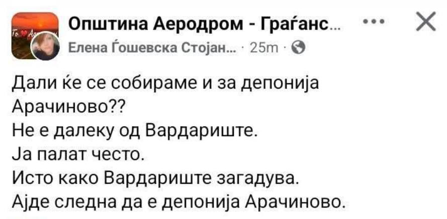 На повик на загрижените граѓани за масовна излезност на протест против труењето на аеродромци од депонијата Вардариште, главната инспекторка во Општина Аеродром, Елена Ѓошевска Стојановска, наместо да застане во одбрана на здравјето на жителите, си дозволи со цинизам и навреди да им порача на жителите да протестираат во Арачиново. – пишуваат од партијата Левица