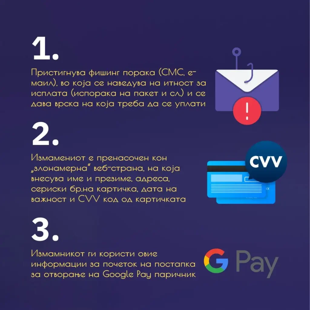 Од Банката додаваат дека измамениот е пренасочен кон „злонамерна“ веб-страна, на која внесува име и презиме, адреса, сериски брoj на картичка, дата на важност и CVV код од картичката. Измамникот ги користи овие информации за почеток на постапка за отворање на Google Pay паричник.