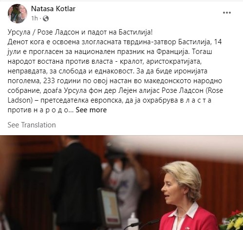 Денот кога е освоена злогласната тврдина-затвор Бастилија, 14 јули е прогласен за национален празник на Франција. Тогаш народот востана против власта – кралот, аристократијата, неправдата, за слобода и еднаковост. За да биде иронијата поголема, 233 години по овој настан во македонското народно собрание, доаѓа Урсула фон дер Лејен алијас Розе Ладсон (Rose Ladson) – претседателка европска, да ја охрабрува в л а с т а против н а р о д о т. За неа е разбирливо, со трговско-колонизаторска култура и семејство блиско на кралскиот двор, да брани ненародна власт! Но, да се труди околу нашиве лумпен-парламентарци со „државничка“ аура, срамна работа е! Тоа се неморални чудовишта, никаквеци со плитка општествена идеја и грдосија, извитоперени карикатури. И да потстрекнуваш класа на вакви политичари, небаре од Бога поставени, а не од народот – кои владеат и одлучуваат „транзиционо“ за сè во македонското општество, значи премногу феудално. Па затоа и падна Бастилија!, пишува професорката Наташа Котлар на социјалните мрежи.