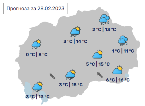 Од УХМР јавуваат дека времето денеска ќе биде претежно облачно, попладне со врнежи од дожд, наместа пообилни. Врнежите ќе продолжат и во вечерните часови. Ќе дува слаб до умерен ветер од југоисточен правец.