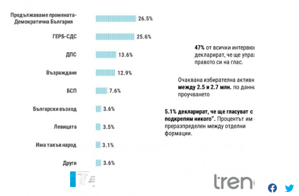 Резултатите покажуваат поддршка од 26,5% за PP-DB наспроти 25,6% за GERB-SDS. На третата позиција е ДПС со 13,6%, малку пред „Вазраждане“ (12,9%). Само уште една партија собира поддршка над бариерата од 4 отсто за влез во Народното собрание – БСП со 7,5%.