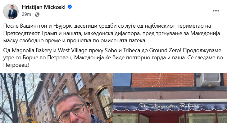 Од Magnolia Bakery и West Village преку Soho и Tribeca до Ground Zero! Продолжуваме утре со Борче во Петровец. Македонија ќе биде повторно горда и ваша. Се гледаме во Петровец!