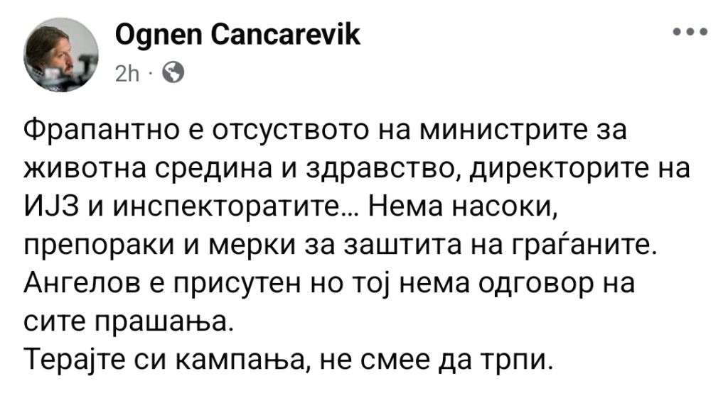 Новинарот Чанчаревиќ: Фрапантно е отсуството на министрите за животна средина и здравство, директорите на ИЈЗ и инспекторатите