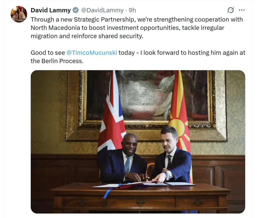 Ја зајакнуваме соработката со Македонија преку ново стратешко парнерство, објави на платформата Х секретарот за надворешни работи на Обединетото Кралство Дејвид Лами по повод потпишувањето на Декларација за стратешко партнерство меѓу двете земји.
