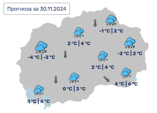 Од УХМР јавуваат дека времето денеска ќе биде претежно облачно и постудено со повремени врнежи, кои во западните и јужните делови ќе бидат поројни и обилни (над 50 л/м2). На планините врнежите ќе бидат од снег од 40 до 50 см, на повисоките места од 10 до 30 см, а во некои пониски места од дожд и снег и ќе се формира помала снежна покривка. Во југоисточните делови ќе бидат само од дожд. Ќе дува умерен, а на планините силен северен ветер.