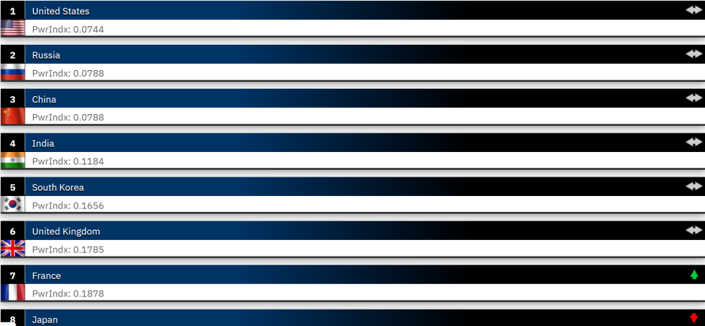 Прва во светот е армијата на САД, втора е Русија. Кина е на третото место, а Индија на четвртата позиција. Меѓу првите 10 се и Јужна Кореја, Обединетото Кралство, Франција, Јапонија, Турција и Италија.