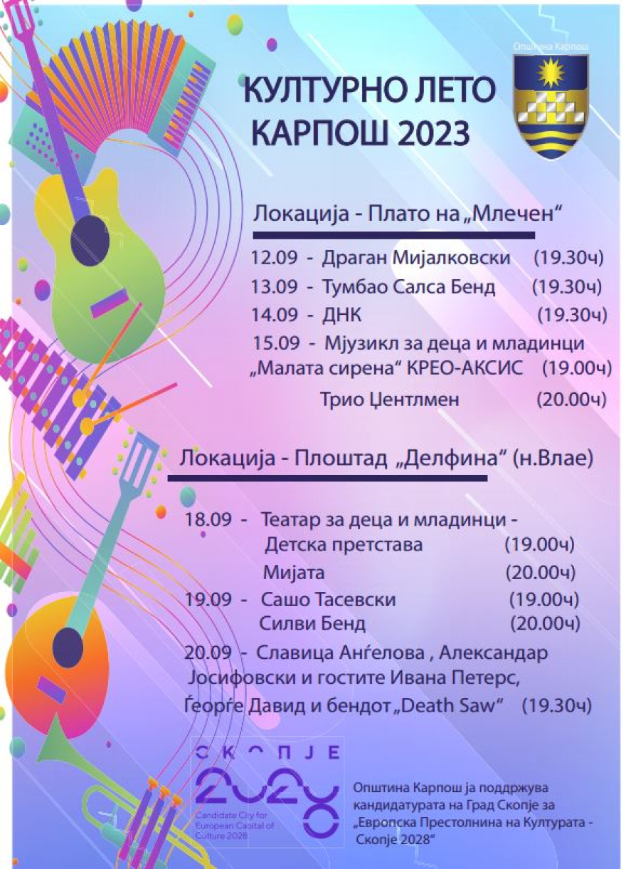 Од 12. септември, на платото на „Млечен“ ( месна заедница „Владо Тасевски“) со почеток во 19.30 часот со настап на Драган Мијалковски ќе започне традиционалната културна манифестација на општина Карпош, „Карпошово културно лето 2023“.