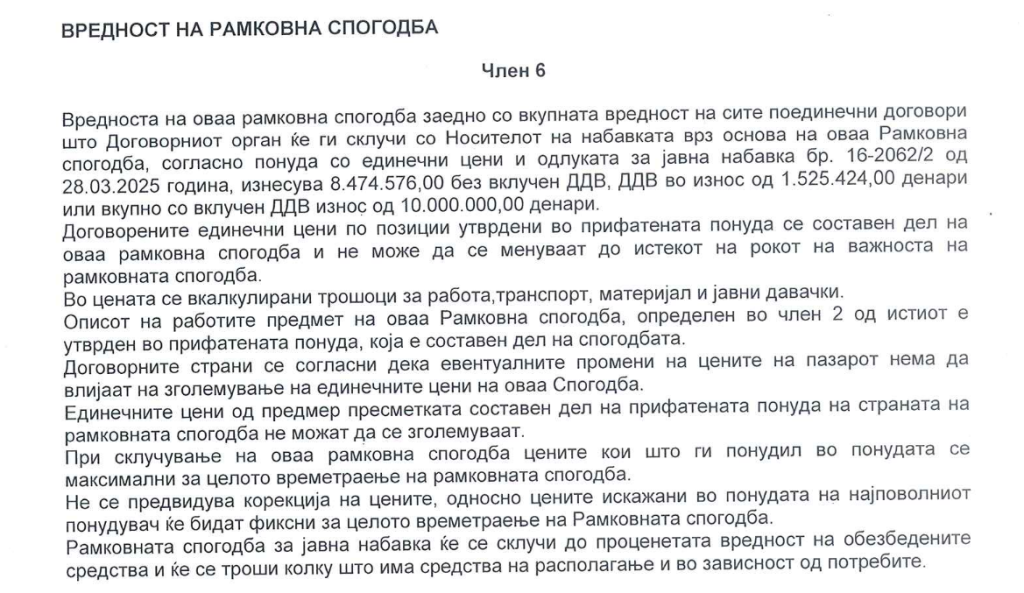 Општината инаку има склучено рамковна спогодба во вредност од 10 милиони денари.