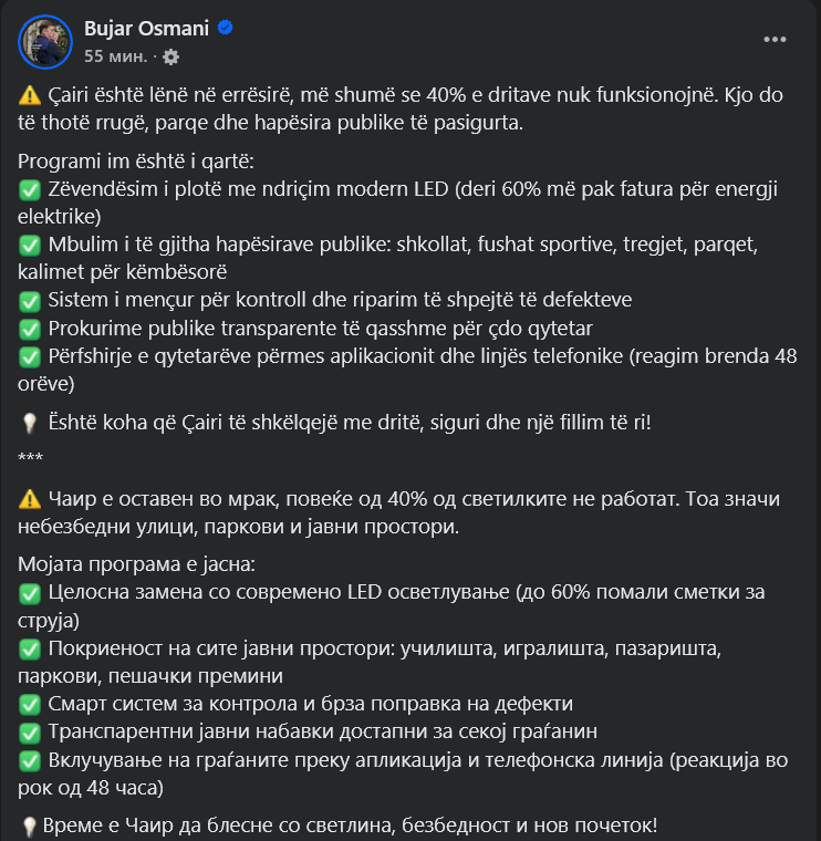 Време е Чаир да блесне со светлина, безбедност и нов почеток! – напиша Османи на Фејсбук.