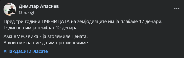 Пратеникот Димитар Апасиев го коментира „зголемувањето на цената“ за пченицта.