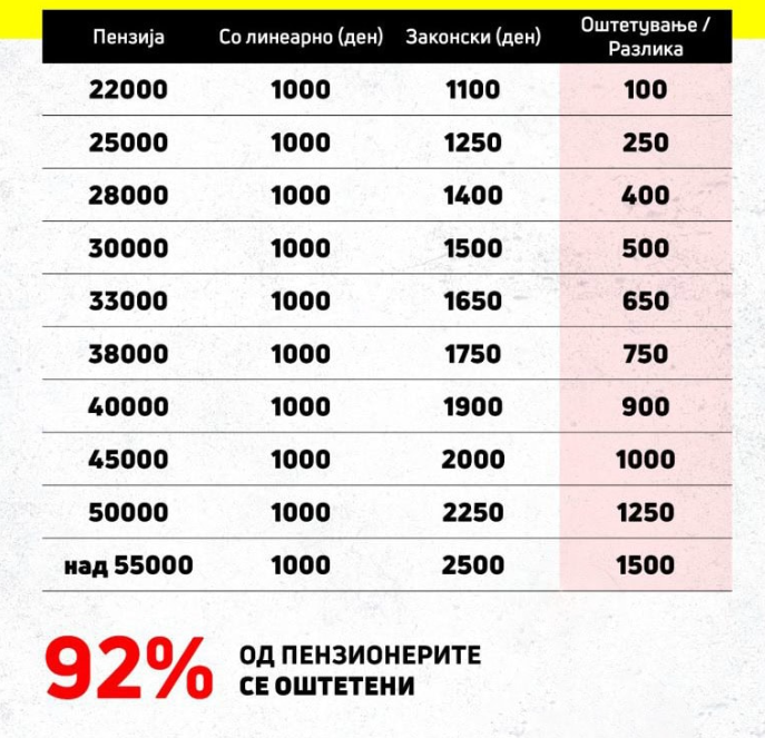 „За пензија од 25.000 денари зголемувањето ќе беше 1.250 денари, а сега се добива само 1.000 денари. Кај повисоките пензии штетата е уште поголема. На пример, за пензија од 40.000 денари, наместо 2.000 денари, пензионерите ќе добијат двојно помалку“, укажуваат од опозициската партија. Од Владата побараа да го повлече предложениот модел и пензионерите да добијат зголемување согласно важечкиот закон и нивниот реален придонес во системот.