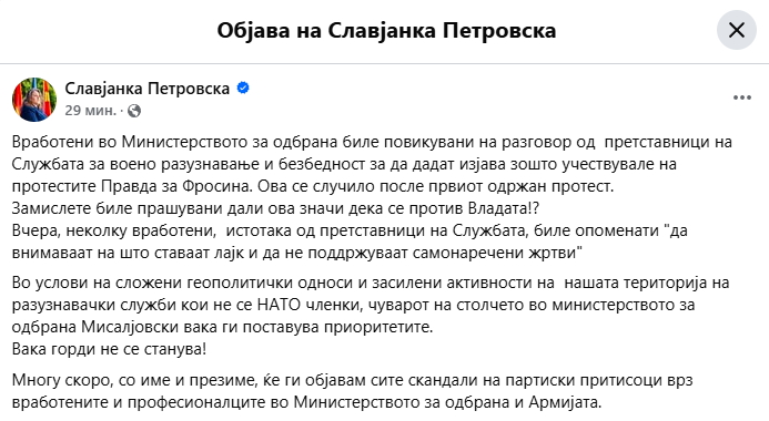 Вработени во Министерството за одбрана биле повикувани на разговор од претставници на Службата за воено разузнавање и безбедност за да дадат изјава зошто учествувале на протестите Правда за Фросина. Ова се случило после првиот одржан протест, открива пратеничката и поранешна министерка Славјанка Петровска.