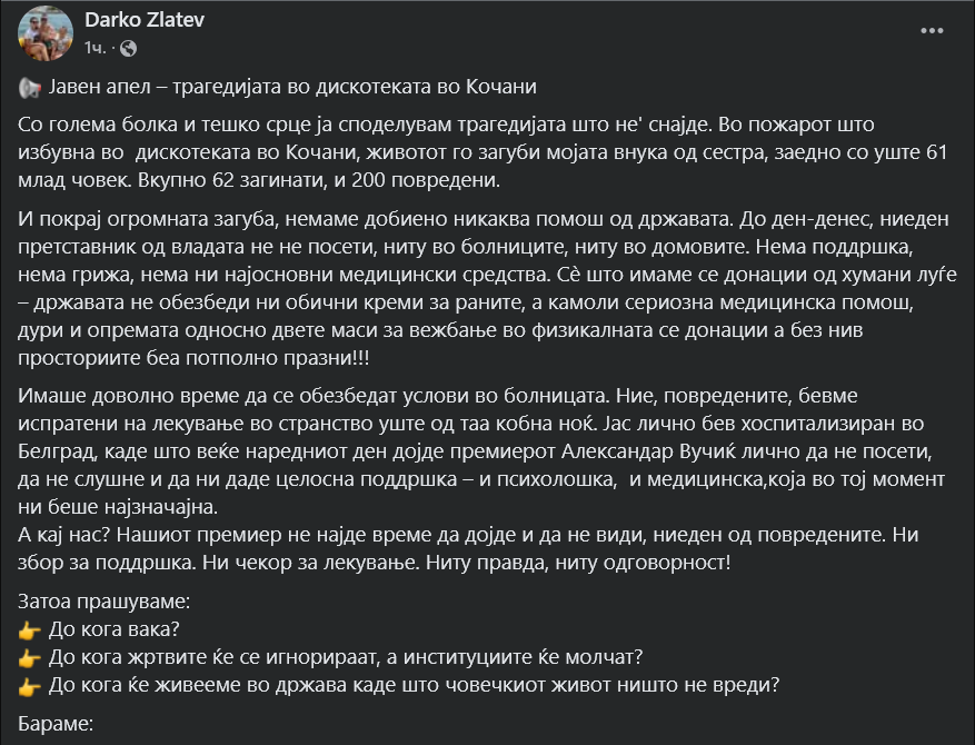 *Објава на Фејсбук на Дарко Златев, повреден во трагедијата во Кочани