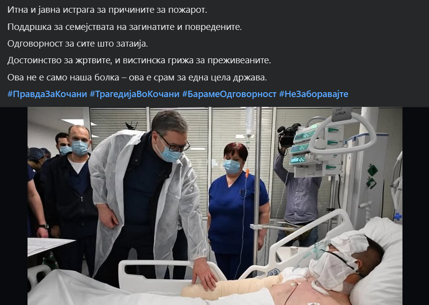 А кај нас? Нашиот премиер не најде време да дојде и да не види, ниеден од повредените. Ни збор за поддршка. Ни чекор за лекување. Ниту правда, ниту одговорност!