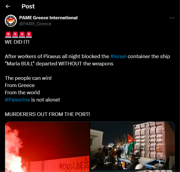 Десетици членови на грчкиот синдикат на пристаништето во Атина го блокираа товарењето на контејнер со муниција наменета за Израел во знак на протест против војната во Газа, изјавија во петокот за Ројтерс претставници на крајбрежната стража и синдикатот.