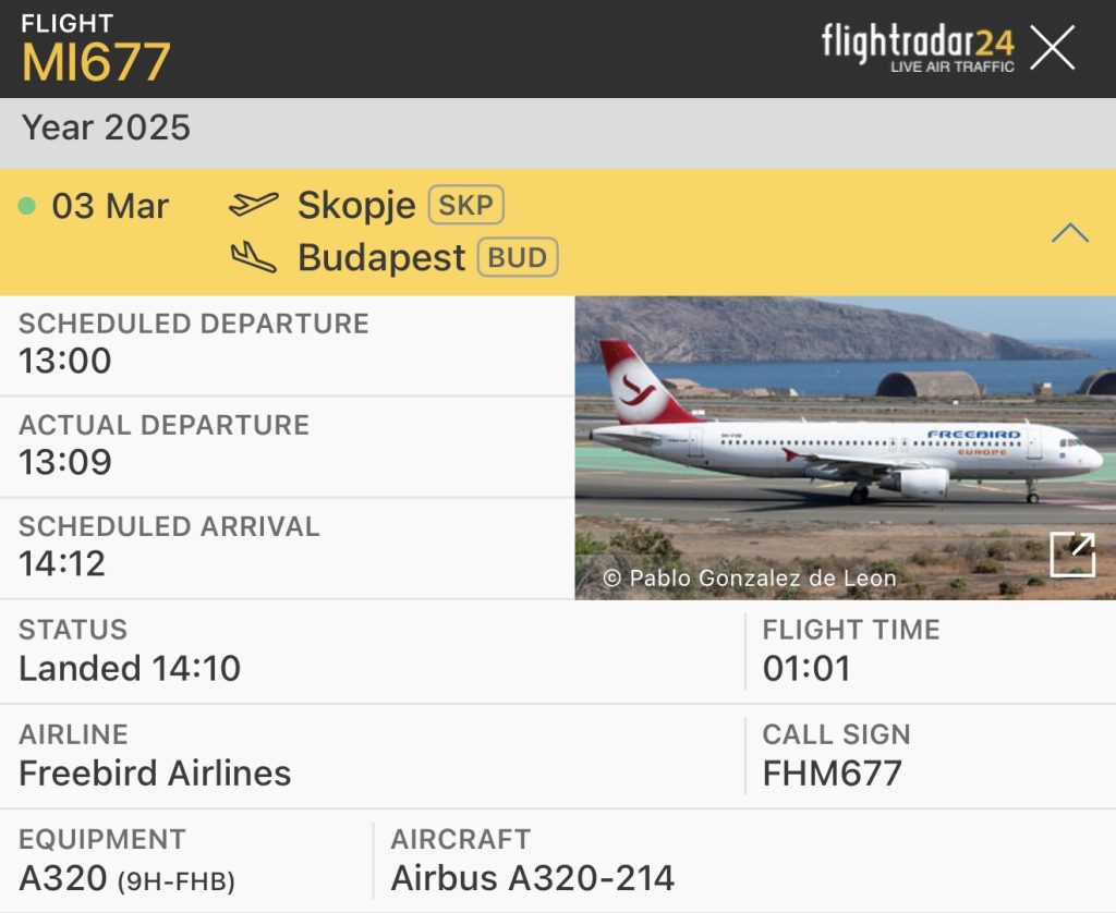 На принтскринот подоле, од десно, се гледа времето на полетување на авионот од Анталија, кога слетува во Скопје и како од Скопје, откако ги собира членовите на Владата заминува во Будимпешта. Дека се работи за истиот авион може да видите на принтскринот од левата страна, каде исто така има податоци за летот од Скопје до Будимпешта.