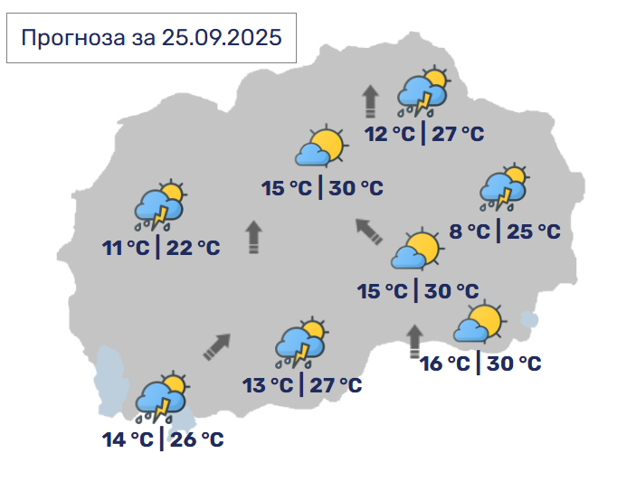 Променливо облачно со сончеви периоди. Попладне ќе…