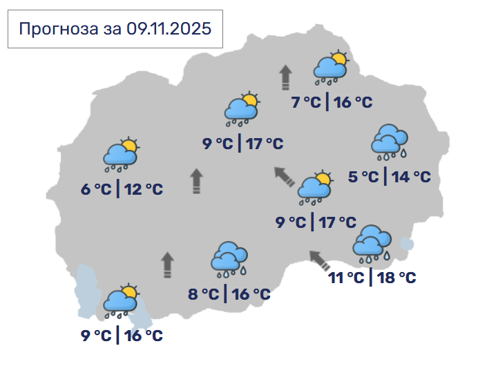 Во Скопје, променливо облачно со повремен слаб дожд. Ќе дува слаб до умерен ветер од јужен правец.