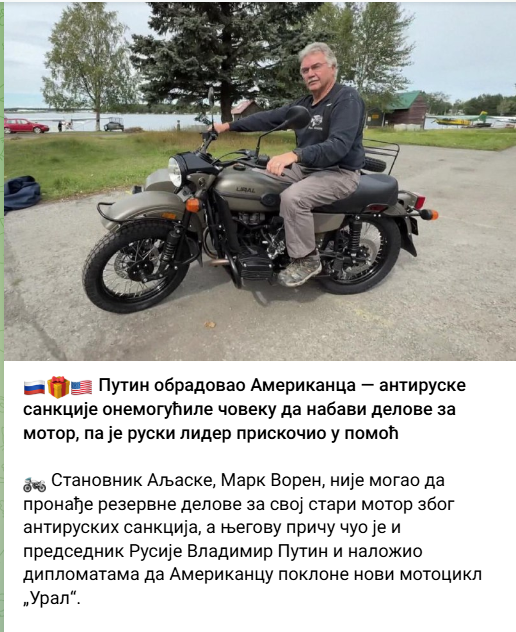 Владимир Путин му подари нов мотоцикл „Урал“ на жителот на Алјаска, Марк Ворен, објави телевизискиот канал „Русија 1“. „Морам да кажам дека ова е личен подарок од претседателот на Руската Федерација“, рече Андреј Леденев, советник во руската амбасада во САД.
