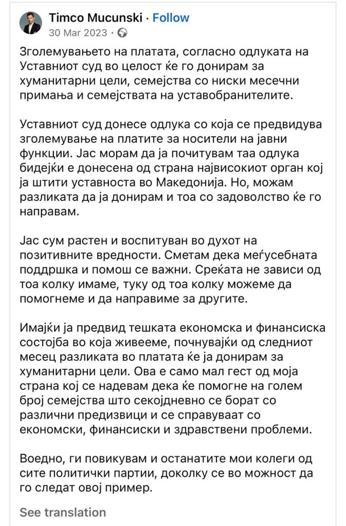 Претходно од ВМРО-ДПМНЕ велеа дека Артан Груби е човек без срам, носи патики од 450 евра и во очи и се смее на целата македонска јавност. Бидејќи ќесто сакаат да кажат дека се доследни на нивните ставови, очекуваме ВМРО-ДПМНЕ да реагира и на стандардот и стилот на Тимчо Муцунски и да напише дека: