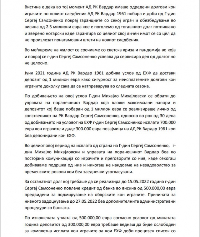 Два часа пред да започне прес-конференцијата на првиот човек на РК Вардар 1961, со соопштение се огласи Давор Стојаноски, извршниот директор на клубот во ерата на Сергеј Самсоненко. Стојаноски вели дека поранешниот газда, Сергеј Самсоненко, со личен имот гарантирал дека на сите ќе им исплатат долговите, но дека светската криза поради пандемијата со коронавирусот го спречила да ги испочитува сите рокови. Истовремено, на тогашните предводници на вардарци им била ветена помош од 2,5 милиони евра од државата, која не била реализирана. Во продолжение, тој дел од вината префрла и на банките за доцнење на реализација на бараните кредити, а го напаѓа и ЕХФ дека сака на сметка на Вардар на мала врата во ЛШ да вметне екипи како Алборг, за кој игра еден од најдобрите ракометари на светот, Микел Хансен.