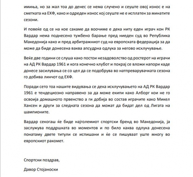 Првиот човек на Вардар во овој момент пак, Михајло Михајловски на денешната прес-конфренција за разлика од Давор Стојаноски не сакаше да говори на тема Алборг, а исто така и додаде дека се двоуми дали да тужи, бидејќи луѓето во ЕХФ биле многу суетни, па можело да се случи следната сезона кога ќе треба, некоја македонска екипа повторно да добие компликации од ЕХФ. Исто како и соопштението на Давор Стојаноски, првиот човек на клубот призна дека не се испочитувани сите рокови во целост на плаќањето, но се ,,извади” со зборовите дека не добиле никакво предупредување од ЕХФ за можното сценаријо кое се случи.