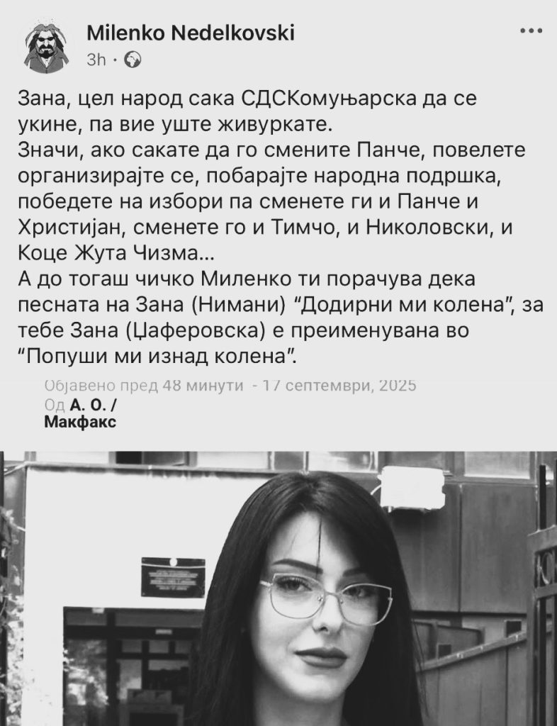 Во денови кога Македонија е потресена од грозоморни случаи на фемицид, кога растат насилствата и убиствата врз жени, кога мајки, сестри и ќерки живеат во страв поради неспособност на институциите, Миленко Неделковски, пуленот на ВМРО-ДПМНЕ си навреди и омаловажувања кон жените. – пишува во соопштението на СДСМ
