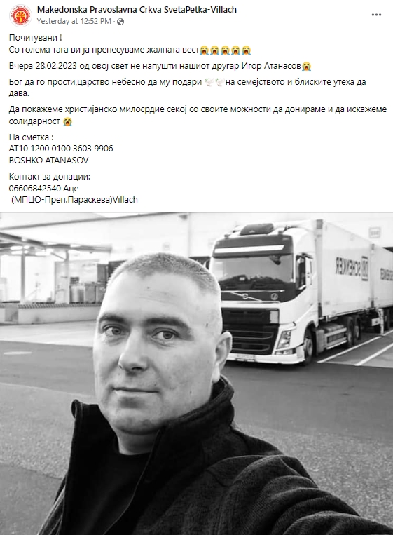 – Почитувани. Со голема тага ви ја пренесуваме жалната вест😭😭😭😭😭 Вчера 28.02.2023 од овој свет не напушти нашиот другар Игор Атанасов😭 Бог да го прости,царство небесно да му подари 🕊🕊 на семејството и блиските утеха да дава. Да покажеме христијанско милосрдие секој со своите можности да донираме и да искажеме солидарност, објавено е на ФБ страната на Македонската православна црква Преподобна Параскева (Света Петка) од Вилач, Австрија.