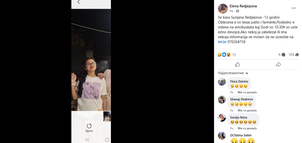 Се бара Суријана Реџепова, 13 години, облечена е во тексас палто и фармерки. Последно е видена на автобуската кај Годи во 10.30 часот со уште едно девојче. Ако некој ја забележи нека го бара семејството на 070264758.