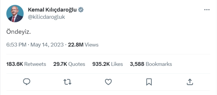Најголемиот ривал на Ердоган на денешните претседателски избори во Турција Кемал Киличдароглу на Твитер напиша дека води на изборите.