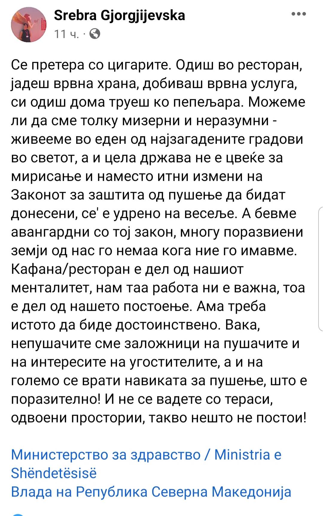 Се претера со цигарите. Одиш во ресторан, јадеш врвна храна, добиваш врвна услуга, си одиш дома труеш ко пепељара. Можеме ли да сме толку мизерни и неразумни – живееме во еден од најзагадените градови во светот, а и цела држава не е цвеќе за мирисање и наместо итни измени на Законот за заштита од пушење да бидат донесени, сe’ е удрено на весеље.