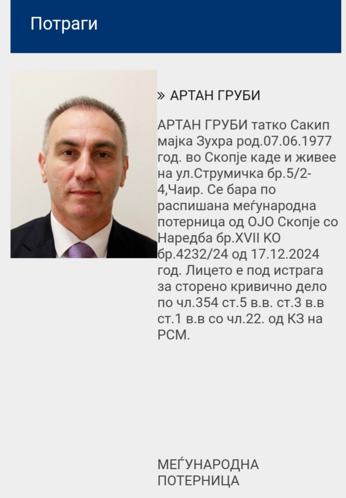 МВР пред малку објави меѓународни потерници за поранешниот вице премиер Артан Груби и екс директорот на Лотарија Перпарим Бајрами.