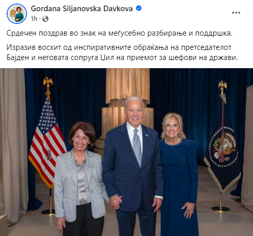 Претседателката Гордана Сиљановска Давкова, за време на официјалниот престој во САД во рамките на Генералното собрание на ОН, оствари средба со високиот претставник на Стејт департментот на САД за Западен Балкан. Таа на својот Фејсбук профил сподели и фотографија со претседателот Џо Бајден и неговата сопруга Џил.
