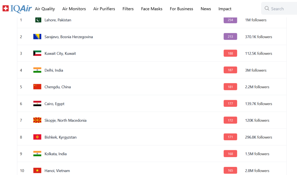 Според подататоците на IQAir, Скопје и утрово е втор најзагаден град во Европа со индекс на загаденост од 172. На прво место е Сараево, каде индексот на загаденост е 213.