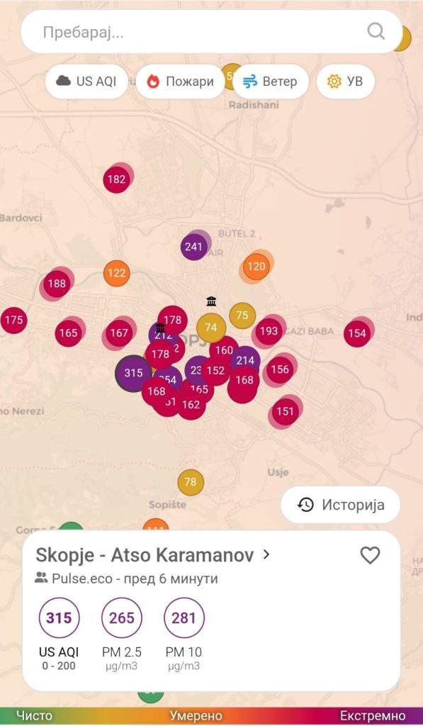 Според податоците од апликацијата „Air Care“, на одредени мерни станици во Скопје загадувањето, односно концентрацијата на ПМ-10 честички надминува 300.
