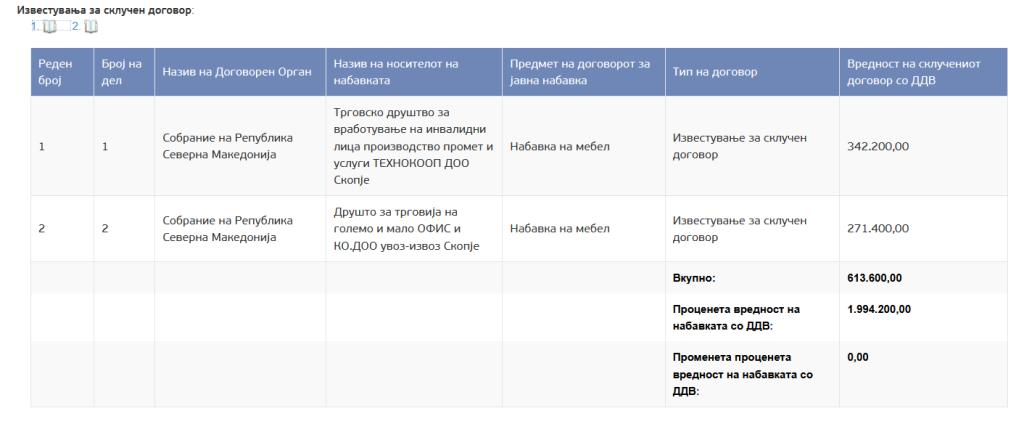 Собранието набавува канцелариски мебел и фотелји за 613.600 илјади денари. На веб-страницата за јавни набавки денеска е објавена набавката за канцелариски материјал, а договор е склучен со две компании.