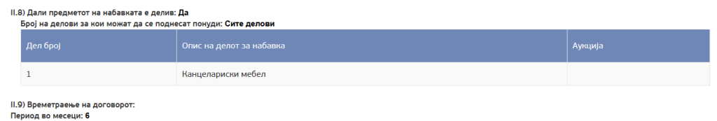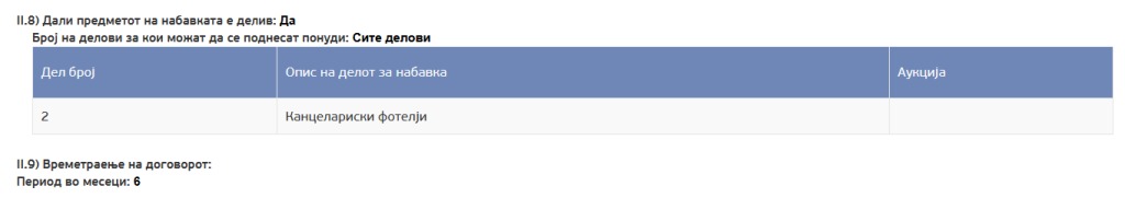 Како што може да видите во продолжение, едниот дел од набавката се однесува на канцелариски фотелји, а другата на канцелариски мебел.