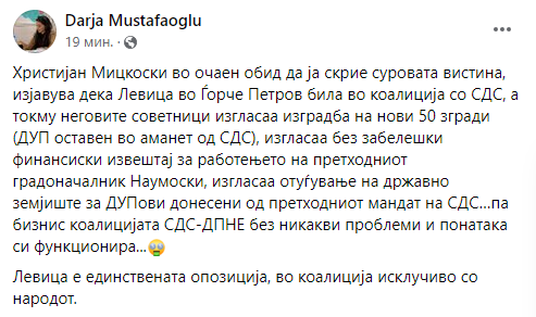 Советничката од Левица во општина Ѓорче Петров, Дарја Мустафоглу, го потсетува Мицкоски дека токму советниците на ВМРО-ДПМНЕ во Ѓорче изгласаа ДУП со вцртани 50 згради, додека тој збирува дека Левица соработува со власта.