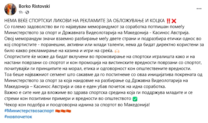 Ристовски уште на почетокот на доаѓањето на функцијата најави дека ќе се бори за прекинување на праксата спортисти да промовираат игри на среќа.