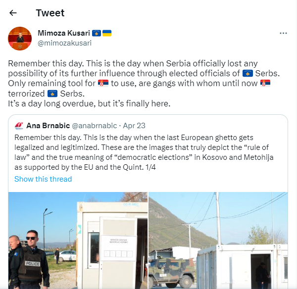 Кусари Љиља напиша на Твитер, одговарајќи на твитот на српската премиерка Ана Брнабиќ, дека единственото преостанато средство на Србија се „бандите со кои до сега ги тероризираше Србите на Косово“.