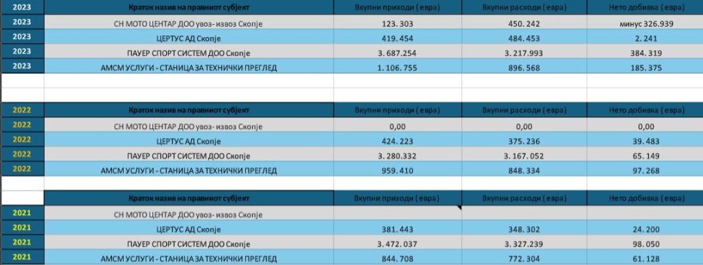 Нивниот вкупен профит во 2023 година изнесувал повеќе од половина милион евра, односно 571.936 евра, и е речиси тројно поголемен во однос на претходната година кога заедничката заработка на овие три фирми била 201.900 евра. Во првата година од своето работење, СН МОТО ЦЕНТАР ДОО увоз- извоз Скопје, 2023 година ја завршиле со загуба од 326.939 евра.