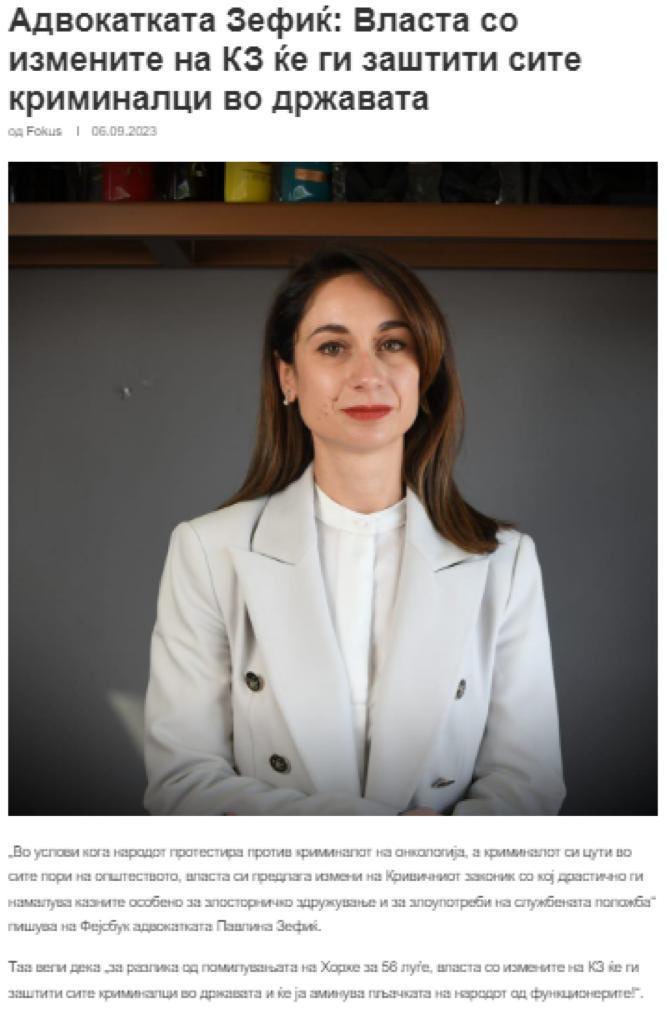 Зефиќ ја отвара својата канцеларија во 2014 година, па малку и зачудува фактот што претседател на Врховен суд избира да ја застапува и не така искусен адвокат. Зефиќ изминатиов период се истакна во јавноста со ставови блиски до ставовите на Мицкоски. Таа жестоко ги нападна измените во Кривичниот законик, пишувајќи „за разлика од помилувањата на Хорхе за 56 луѓе, власта со измените на КЗ ќе ги заштити сите криминалци во државата и ќе ја аминува пљачката на народот од функционерите!“.