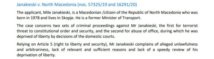 Случајот се однесува на две кривични постапки против г-дин Јанакиески, првата за терористичко загрозување на уставниот поредок и безбедноста, а вториот за злоупотреба на службената положба, при што, тој бил лишен од слобода со одлуки на домашните судови. Повикувајќи се на член 5 (право на слобода и безбедност), г-дин Јанакиевски се жали на наводна незаконитост и самоволие, немање релевантни и доволни причини и немање брз преглед на неговата лишување од слобода. Утврдена е повреда на член 5 став 3 поради немање доволно причини за лишување од слобода на жалителот и повреда на член 5 став 4 поради недостиг на ‘брзо’ преиспитување на лишувањето од слобода на жалителот – се наведува во пресудата.