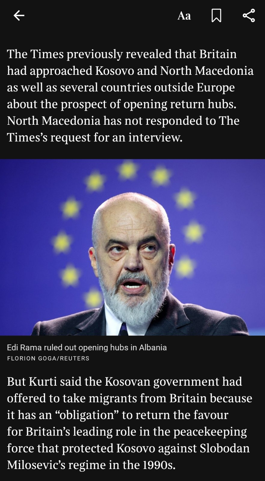 „Тајмс“ претходно откри дека Велика Британија им се обратила на Косово и Северна Македонија, како и на неколку земји надвор од Европа, во врска со можноста за отворање центри за враќање. Северна Македонија не одговори на барањето на „Тајмс“ за интервју.