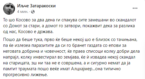 – То шо Косово за два дена ги спакува сите замешани во скандалот со Домот за стари, а домот го затвори, покажвит дека за разлика од нас, Косово е држава.