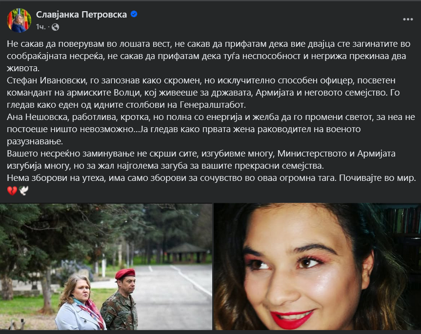 „Не сакав да поверувам во лошата вест, не сакав да прифатам дека вие двајца сте загинатите во сообраќајната несреќа, не сакав да прифатам дека туѓа неспособност и негрижа прекинаа два живота. Стефан Ивановски, го запознав како скромен, но исклучително способен офицер, посветен командант на армиските Волци, кој живееше за државата, Армијата и неговото семејство. Го гледав како еден од идните столбови на Генералштабот. Ана Нешовска, работлива, кротка, но полна со енергија и желба да го промени светот, за неа не постоеше ништо невозможно…Ја гледав како првата жена раководител на военото разузнавање. „Вашето несреќно заминување не скрши сите, изгубивме многу, Министерството и Армијата изгубија многу, но за жал најголема загуба за вашите прекрасни семејства. Нема зборови на утеха, има само зборови за сочувство во оваа огромна тага. Почивајте во мир“, напиша Петровска