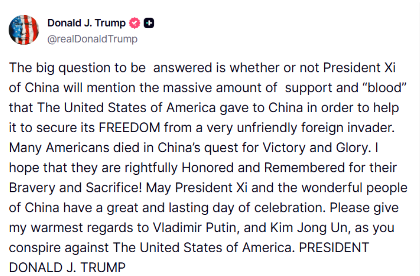 „Нека претседателот Си (Џинпинг) и прекрасниот народ на Кина имаат прекрасен и незаборавен празник. Ве молам, пренесете ги моите најтопли поздрави до Владимир Путин и Ким Џонг Ун додека кроите заговор против Соединетите Американски Држави“, напиша тој на платформата за „Truth social“.