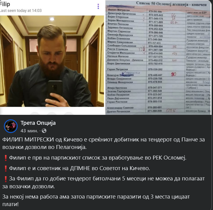 Фејсбук страницата „Трета опција“ сподели нови информации за Филип Митрески од Кичево поврзан со компанијата која ги доби лиценците од МВР за проведување на возачки испити.