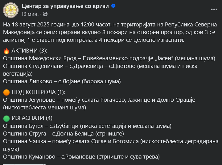 На 18 август 2025 година, до 12:00 часот, на територијата на Република Северна Македонија се регистрирани вкупно 8 пожари на отворен простор, од кои 3 се активни, 1 е ставен под контрола, а 4 пожари се целосно изгаснати: