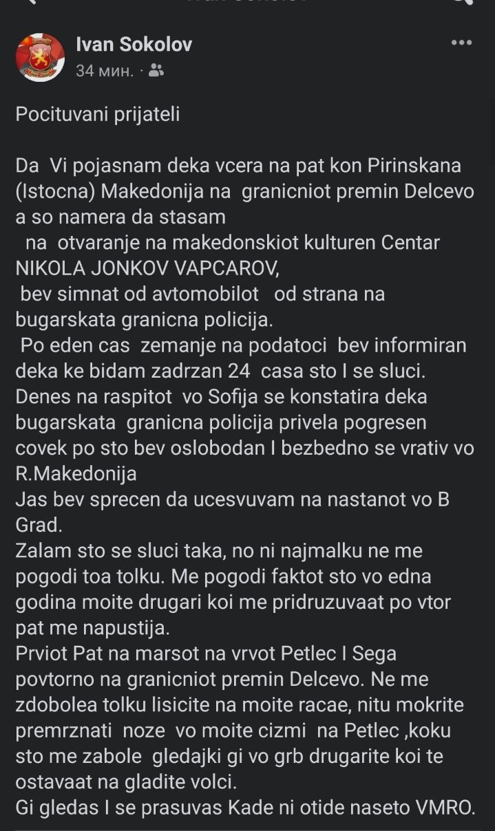 Иван Соколов се огласи на Фејсбук. Во продолжение неговиот статус.